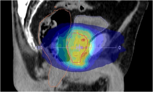青く表示されている箇所は放射線があまり当たりません(直腸)。