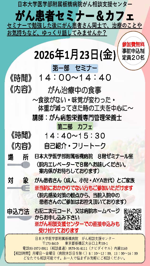 感染症予防のため,事前申込制(定員20名)とさせていただきます。下記URLか,ポスターの二次元コードからお申込みいただけます。がん相談支援センターでの直接申込も受付けております。