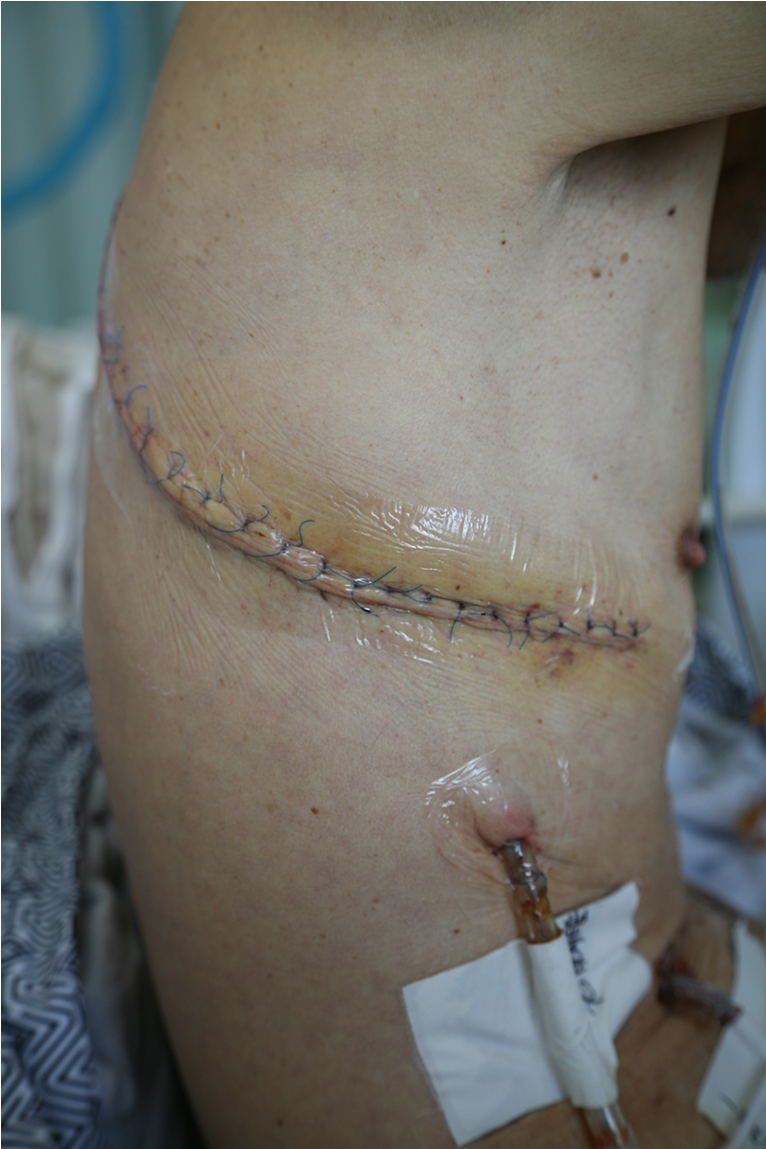 (従来の大開胸の創部) (当院で施行している胸腔鏡下手術の創部)